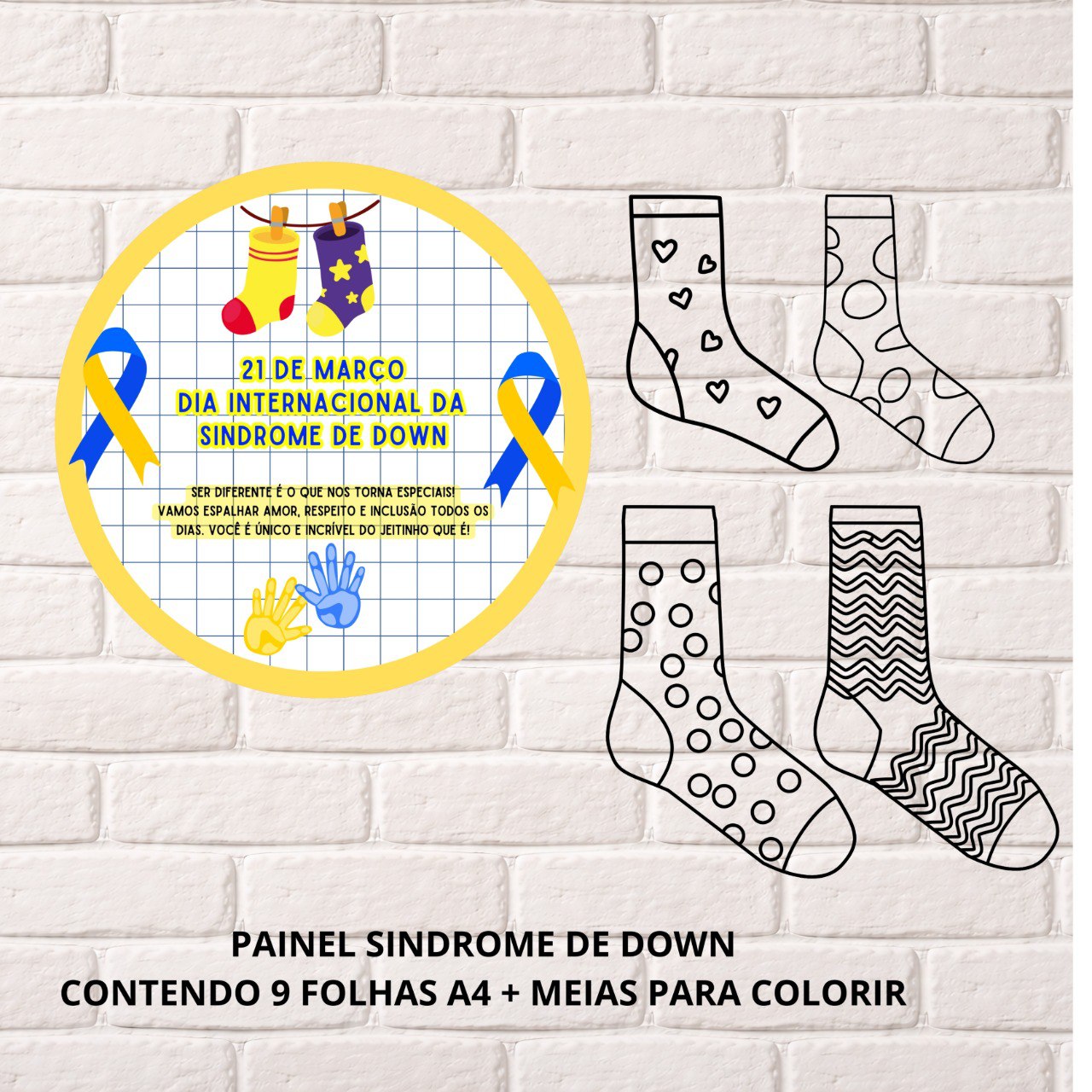 O material é composto por 9 folhas A4, que juntas formam um painel ampliado com excelente visibilidade, além de elementos extras (meias para colorir), símbolo mundial da causa, que incentivam a participação ativa das crianças de forma lúdica e criativa.